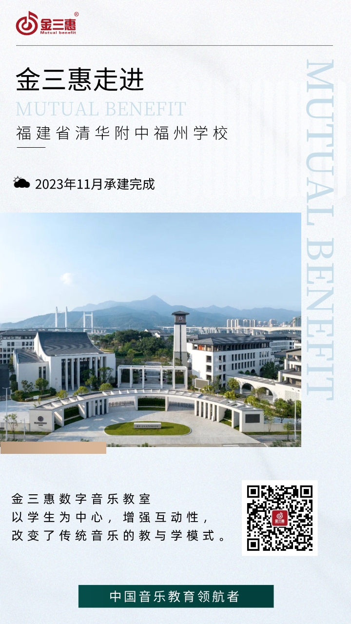 2023年11月,金三惠數字音樂教室走進福建省清華附中福州學校,為學生提供了24+1的數字音樂測評教室,配備了金三惠測評訓練系統、電鋼琴、數字音樂教學儀等教學教具等。測評室-金三惠 (jinsanhui.com)