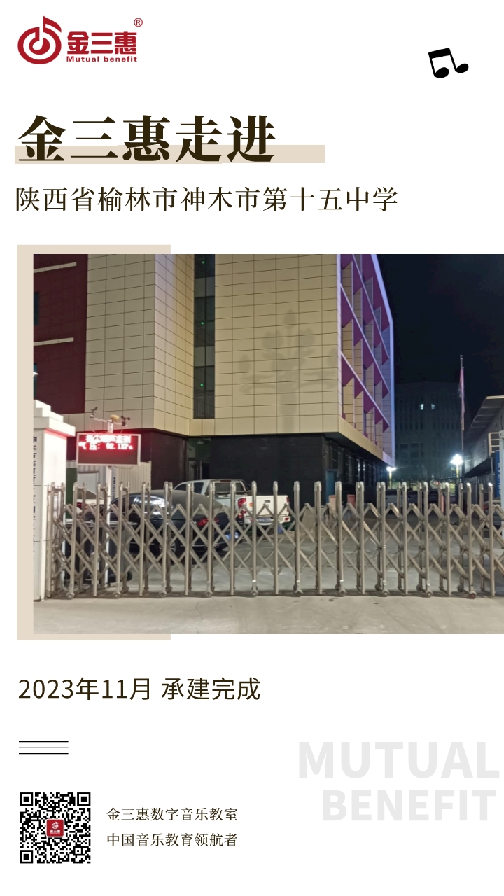 2023年11月,金三惠數字音樂教室為陜西省榆林市神木市第十五中學以及該校小學部提供、安裝、培訓的2套23+1智慧創客音樂教室正式開始使用!配備了金三惠教學系統、電鋼琴、數字音樂教學儀等教學教具。創客教室-金三惠 (jinsanhui.com)