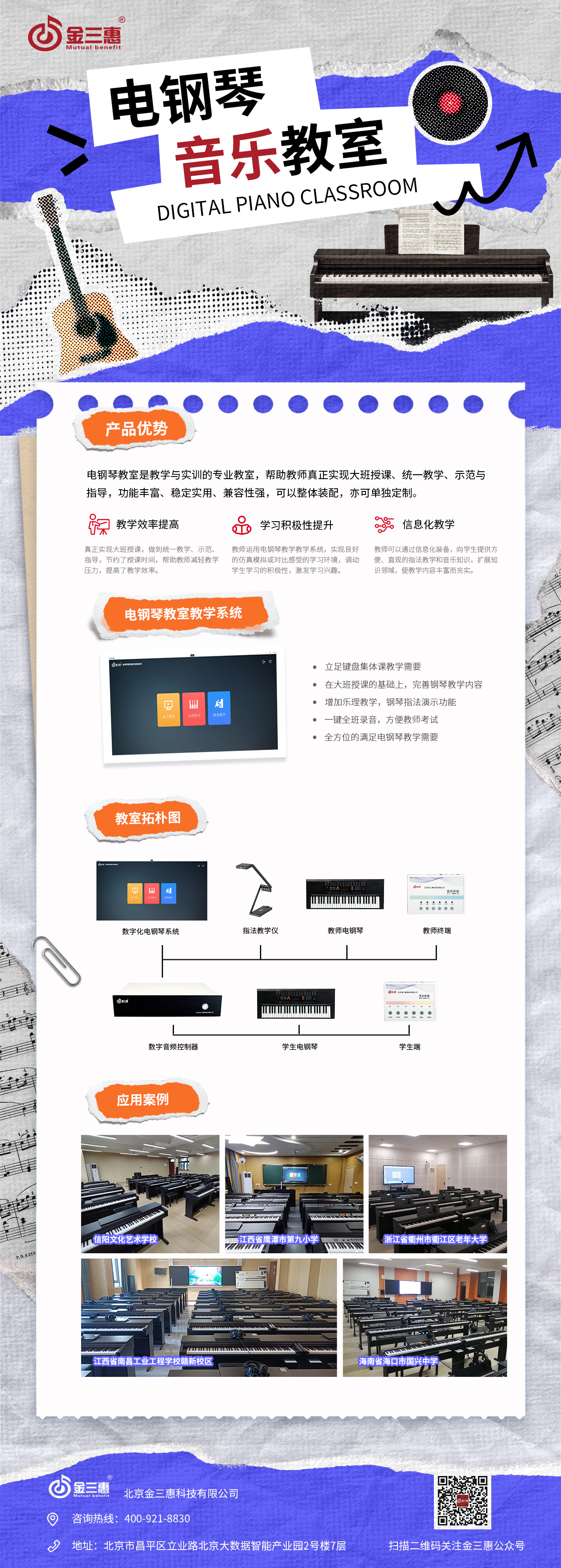 金三惠數字音樂教室以電鋼琴為載體,結合數字化教學系統和管理控制系統,集教、學、練為一體,是鋼琴教學與實訓的專業教室。
