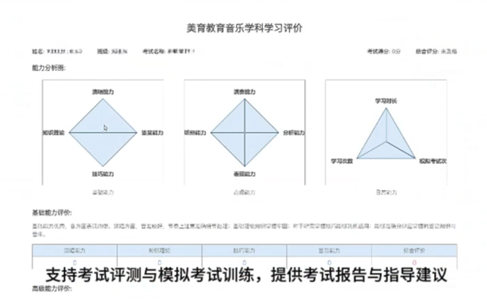 學(xué)生做完后,AI會(huì)立即批改,生成測(cè)評(píng)數(shù)據(jù)分析報(bào)告,并提供指導(dǎo)建議,報(bào)告包括對(duì)演唱、演奏、聽(tīng)辨、知識(shí)理論等多項(xiàng)能力的分析,這種即時(shí)反饋?zhàn)尳虒W(xué)有的放矢,也讓學(xué)生的學(xué)習(xí)更加高效。