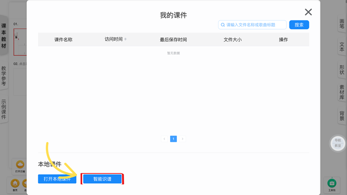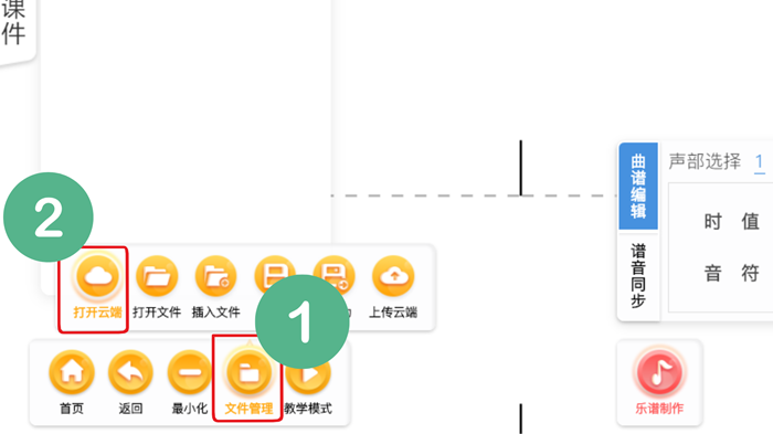 進入金三惠數字音樂教學軟件→點擊創作備課→隨機打開任意譜表→左下角點擊文件管理→打開云端→找到智能識譜→上傳曲譜