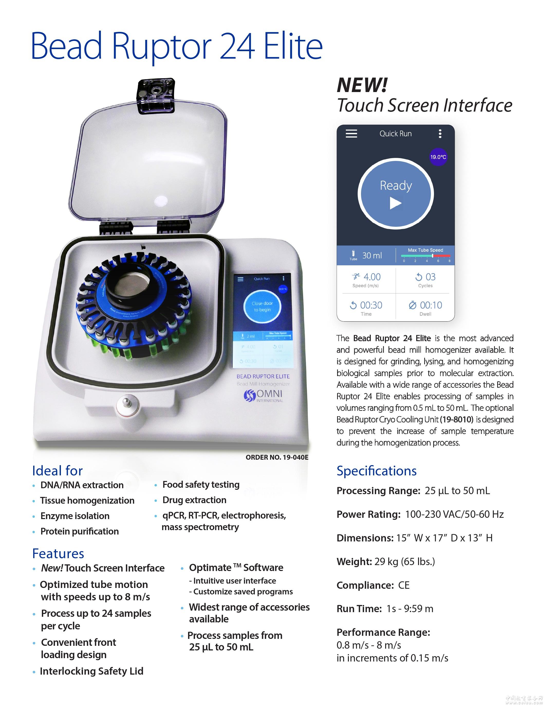 產(chǎn)品詳細介紹OMNI BeadRuptor24Elite多功能樣品均質(zhì)器組織研磨器是一臺集研磨、裂解、均質(zhì)為一體的超級靈活、超級快速和超級高效的多功能樣品均質(zhì)器。它通過獨創(chuàng)的45度高效三維高速運動,輔助研磨珠的敲打,達到對樣品進行研磨、裂解、均質(zhì)的目的。Bead Ruptor 24 Elite最大處理96個樣品管的能力。 特點: 1. 獨創(chuàng)的高效三維高速運動,輔助研磨珠撞擊,優(yōu)化研磨珠運動減少渦流,提高處理效率減少樣品發(fā)熱可有效均質(zhì)動植物組織、細菌、真菌,以及孢子、毛發(fā)、骨骼、糞便、土壤等頑固樣品, 提取DNA、RNA、蛋白、小分子藥物等成分 2. 可同時最多處理24個2ml/1.5ml/0.5ml、12個7ml、3個15ml、6個30ml、3個 50ml、96個0.1-1.2ml樣品管(需選配適配器) 3. 可使用1.5ml、15ml、50ml普通尖底離心管,耗材開放 4. 均質(zhì)速度大,處理時間短(40s以內(nèi)),樣品升溫小 5. 單樣品單管操作,不會出現(xiàn)交叉污染 6. 不僅省時省力,而且批間、批內(nèi)差異更小 7. 抽提的蛋白比活更高,核酸片斷更長 8. 前置式開蓋,便捷裝載樣品 9. 運行結(jié)束后無需等待即可再次運行,提高了實驗效率 10. 對樣品溫度要求極為苛刻的用戶,有 BR-Cryo冷卻系統(tǒng)供選配 技術(shù)參數(shù): 1. 均質(zhì)速度0.8 - 8m/s,0.15m/s可調(diào) 2. 單個樣品處理體積范圍0.1-50ml 3. 通過 設備上的Optimate軟件可輕松直觀的設定程序,每個程序最高可設10個循環(huán) 4. 主機16G內(nèi)存,可存儲100萬個程序,通 過USB接口可無限存儲程序 5. 運行時間1s-9m59s,1s可調(diào);暫停時間0-9m59s,1s可調(diào) 6. 螺紋壓蓋固定研磨管,緊固鎖防止螺紋倒滑,使得樣品放置更方便、快捷,安全,不會發(fā)生真空壓蓋因壓力不夠脫落的危險 7. 15ml、30ml、 50ml適配器采用專利的頂珠固定技術(shù),研磨管取放更快捷,運行更安全 8. 研磨管無需平衡,即插即用,運行穩(wěn)定 9. 過溫保護,開蓋保護 10. 7英寸LCD彩色觸摸大屏,實時顯示程序進程、樣品腔溫度 11. 尺寸 (L×W×H):38.1×43.18×33cm 12. 重量:29Kg 13. 電源:100–230VAC / 50-60 Hz 14. 廠家通過ISO 9001:2008認證,產(chǎn)品通過CE認證 |
