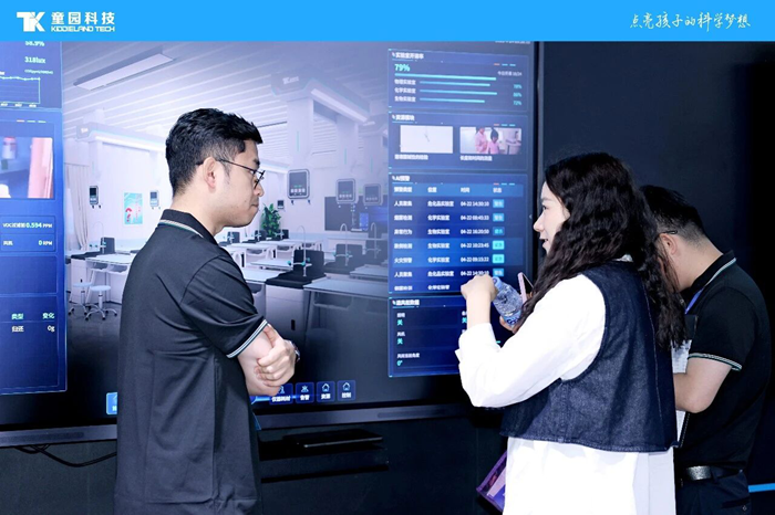 展會期間,出席開幕式的領導、嘉賓專程蒞臨童園科技展位參觀指導。童園科技副總經理胡剛向來訪領導詳細講解了公司在理化生實驗室建設、實驗教學數(shù)字化轉型等領域的最新研發(fā)成果,重點介紹了理化生實驗室管理平臺的核心功能與應用價值。該系統(tǒng)基于物聯(lián)網、人工智能、大數(shù)據(jù)等技術,以智慧大屏為載體,打通“教學管控-安全管理-資源運維”全鏈路,涵蓋設備一鍵管控、實時環(huán)境監(jiān)控、設備狀態(tài)監(jiān)測、耗材及危化品動態(tài)管理、AI安全預警、數(shù)據(jù)化臺賬管理等六大核心功能,實現(xiàn)實驗室從課前準備、課中管控到課后運維的全流程智能化管理,為學校筑牢實驗教學安全防線。