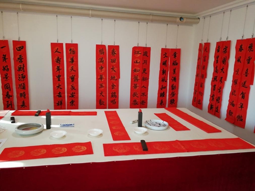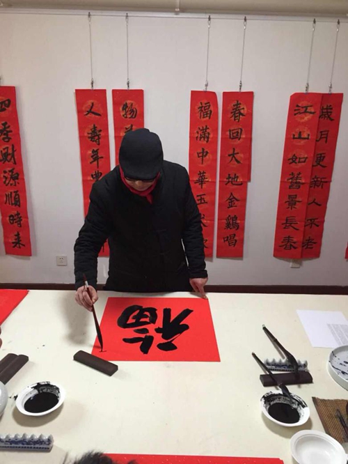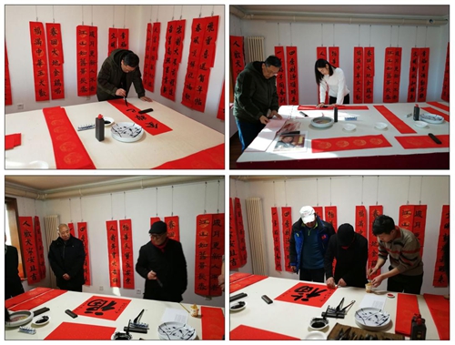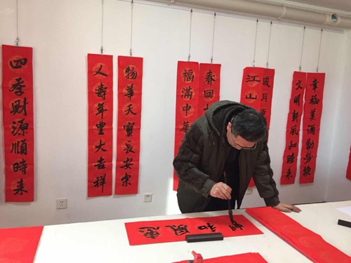 中國書法家協會理事高軍法在大家期待的掌聲中,開始揮毫潑墨。一幅幅寫滿祝福的春聯躍然于紅紙之上,濃濃的情意、真誠的祝福溢于字里行間。他談到:“寫春聯寄托著一種文化情懷,看似寫字,其實是總結過去一年的收獲,對新的一年的展望和期盼。”與印刷春聯不同的是,用傳統的筆墨把想說的話寫進春聯里掛起來,不僅美觀,寓意也好,這就是書法結合春聯所具有的獨特魅力。