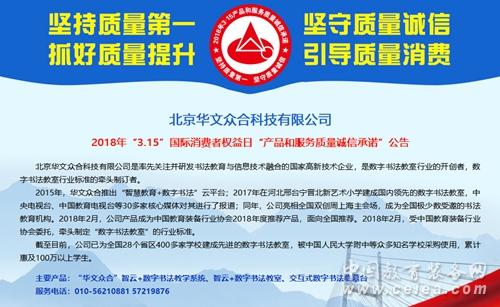在質檢總局產品質量申訴處理中心的支持下,中國質量檢驗協會攜手阿里巴巴、蘋果、華為、格力、長虹、小米等質量誠信示范企業,開展“傳遞質量信任,引導質量消費——堅持質量第一,抓好質量提升;堅守質量誠信,建設質量強國”為主題的“產品和服務質量誠信承諾”活動。作為質量誠信示范企業的一員,華文眾合在產品和服務質量誠信承諾查詢公眾服務平臺發布了質量誠信承諾公告。