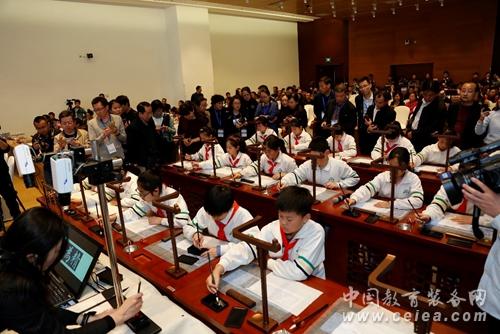 會(huì)上,北京天壇東里小學(xué)的老師和同學(xué)們使用北京華文眾合科技有限公司開發(fā)的“智云+”數(shù)字書法教室,使用傳統(tǒng)的筆墨紙硯,結(jié)合信息化技術(shù),通過示范、互動(dòng)、講評、臨摹練習(xí),為大家展示了一堂別開生面的書法課。
