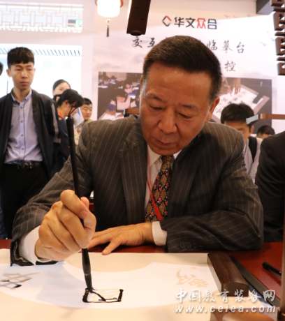 2018年5月11日上午,四川省教育廳巡視員劉東、四川省教育裝備行業協會會長張林祥等一行,到展區巡視。行至8號館北京華文眾合科技有限公司展位,四川省教育廳巡視員劉東對華文眾合“智云+”數字書法教室產生了濃厚的興趣,并親自體驗了數字書法臨摹。