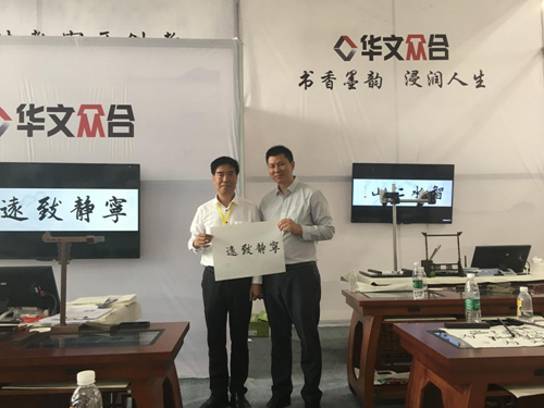 山東省教育技術(shù)裝備中心主任馮俊華在臨沂市教育局梁局長(zhǎng)陪同下蒞臨華文眾合展位進(jìn)行參觀指導(dǎo),華文眾合銷售總監(jiān)向馮主任一行詳細(xì)匯報(bào)了公司在山東的市場(chǎng)營(yíng)銷情況,馮主任一行對(duì)華文眾合為山東書(shū)法教育發(fā)展作出的貢獻(xiàn)表示一致肯定和高度贊揚(yáng)。