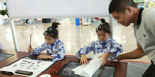 華文眾合智慧書(shū)法教室展位人頭攢動(dòng)