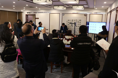 ,北京師范大學湖南省教學名師班在全國著名書法教育家、湖南省中小學教師發展中心副主任、華文眾合書畫教育研究院副院長李再湘帶領下來到華文眾合,考察華文眾合第五代智慧書法教室。華文眾合副總經理陳方義就第五代智慧書法教室的功能、課程,向數十位來訪者進行精辟地介紹。