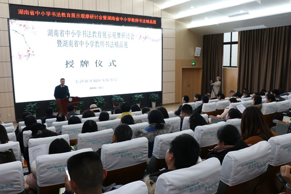 2018年12月26日,湖南省長沙市開福區(qū)實驗小學(xué)在湖南省中小學(xué)教師發(fā)展中心指導(dǎo)下舉辦了“湖南省中小學(xué)書法教育研討觀摩展示會暨湖南省教師書法精品展”。湖南省書法家協(xié)會副主席王希俊,湖南省書法家協(xié)會教育委員會常務(wù)副主任羅紅勝,湖南省中小學(xué)教師發(fā)展中心副主任李再湘,長沙市開福區(qū)教育局黨委委員、副局長王平等出席了活動。逾百名來自湖南省各書法傳統(tǒng)學(xué)校的校長及老師們參加了此次活動。