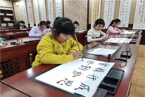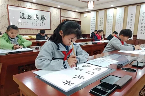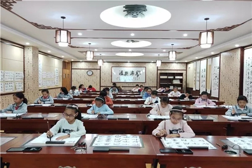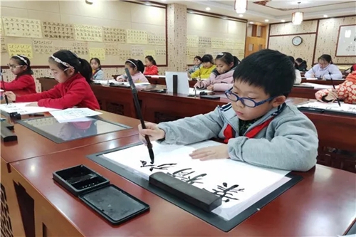 2018年,山東淄博華僑城小學遴選了部分喜愛書法的學生,開設了軟筆書法社團。在已有隸書學習的基礎上,強化基本筆法,并通過華文眾合智慧書法教室指導學生進行集字練習和創(chuàng)作。教學中,老師針對不同學生的書寫情況進行具體指導,通過范寫、比對、點評等方式幫助學生不斷提升書寫水平。