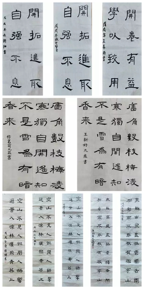 通過一個學期的書法學習,學生創(chuàng)作了四尺四開、四尺三開、四尺對開長條等三種尺寸的隸書作品,書寫質量大幅提升,得到了教師們的認可和家長們的贊許。