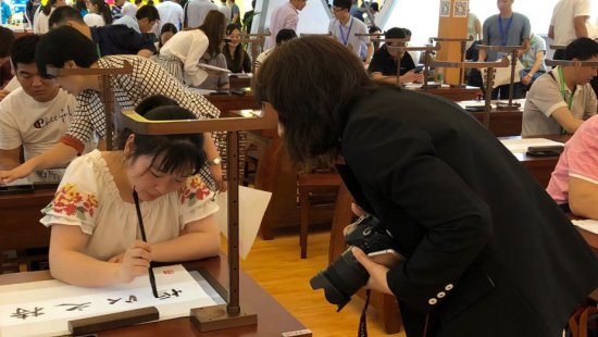 由家長陪同從武漢過來參加展會的兩位小學生,剛剛上一年級,小小的手生澀地握著毛筆,充滿興趣、認認真真,整整寫了一個上午,小朋友們說學校里也開了毛筆課,老師在電腦上講他們在本子上寫,沒有這個好玩沒有這個好寫。