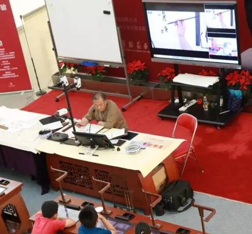 高軍法在教師端的書畫展示臺上為師生們示范書寫,通過直播系統,書寫過程高清同傳到學生端,師生們能多角度觀看示范書寫的下筆、行筆、收筆等過程和細節;在學生練習時,通過互動系統,高軍法可查看到每位師生的練習過程,同時可在教師端的電腦屏幕上對師生作品進行手寫點評,每位師生可同步看到點評過程。