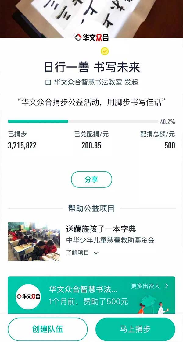 華文眾合還在五周年慶典于騰訊公益平臺進行愛心捐助,通過行走步數為藏族孩子送去字典,為藏族孩子的美好明天添磚加瓦。