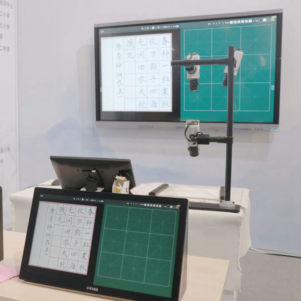 展廳現場工作人員在中控教師端為大家詳細講解了第七代智慧書法教室的最新亮點——筆尖跟蹤技術,工作人員通過中控系統鎖定展廳內所有臨摹桌的畫面,將筆下動作一覽無余地展示給在座所有參觀者,參觀者通過筆尖細節展示可以更加規范地學習每個字每個筆畫的下筆動作,這一功能解決了書法教師在講解教學時無法逐一示范的難題。參觀者對這一技術大為認可,一個小小的攝像頭竟可以對筆尖進行跟蹤,讓學生能精準觀察老師的運筆細節,真正實現科技化傳統教學。