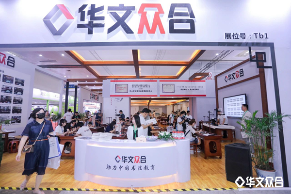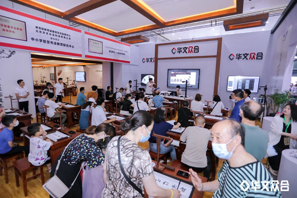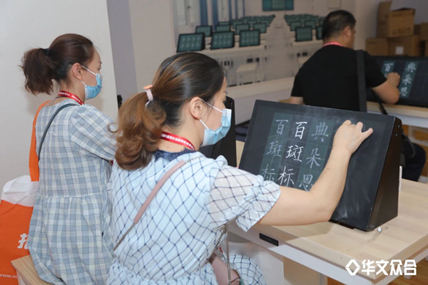 華文眾合工作人員熱情向參觀者介紹智慧書法教室以及智慧粉筆教室