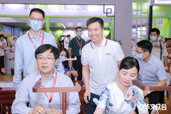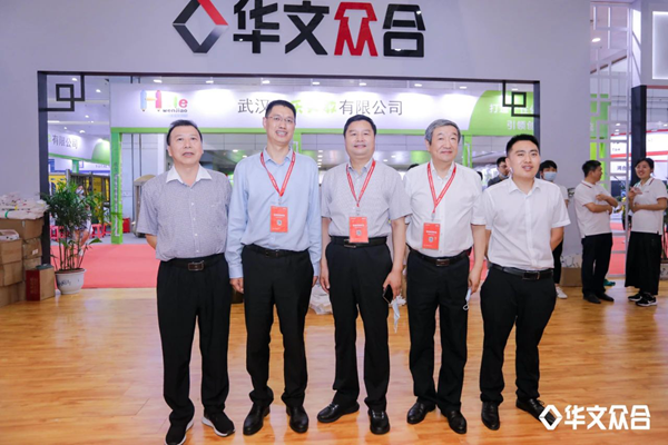 教育部教育裝備研究與發展中心副主任趙憲志(右三)、中國教育裝備行業協會副會長、湖北省教育技術裝備處處長范義虎(右二)一行到華文眾合展位參觀指導