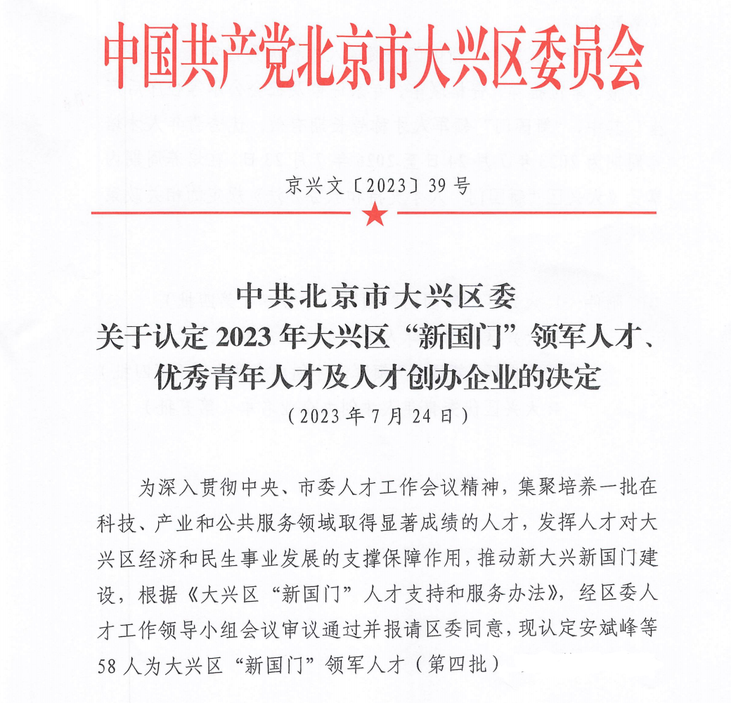 近日,北京市大興區委公布了2023年大興區“新國門”領軍人才名單,認定了58位大興區“新國門”領軍人才(第四批)。北京華文眾合科技有限公司董事長向大鳳榮獲大興區“新國門”科技創新領軍人才稱號。
