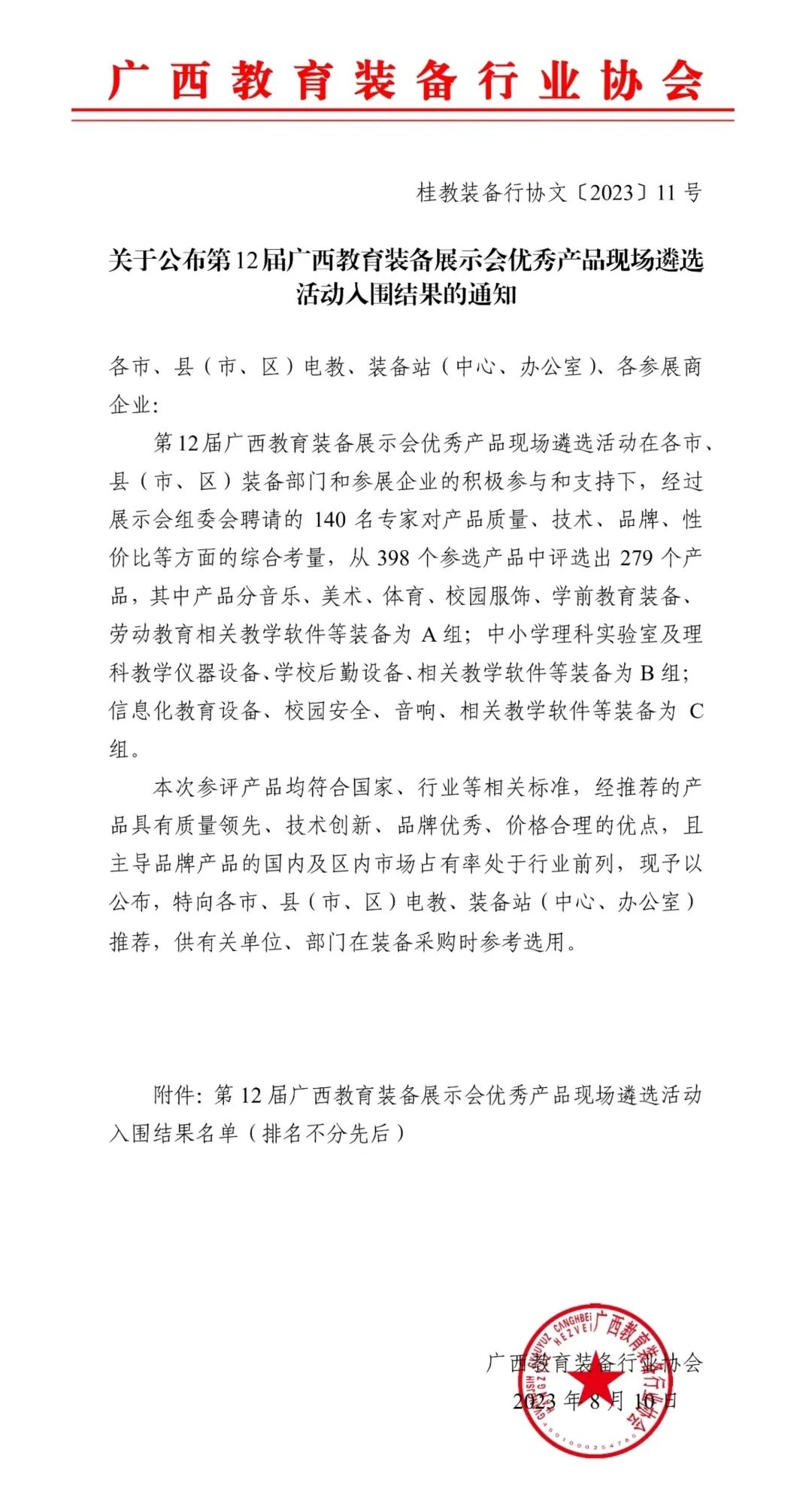 第12屆廣西教育裝備展示會(huì)優(yōu)秀產(chǎn)品推薦目錄評(píng)選結(jié)果公布!