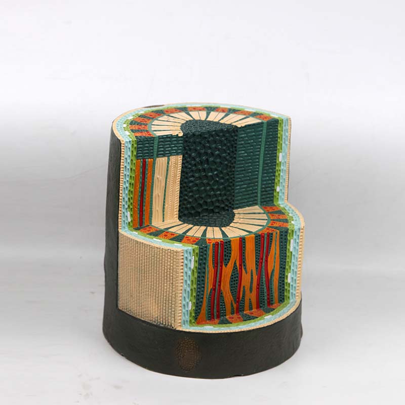 本模型展示雙子葉植物莖的橫切與縱切結構,清晰呈現表皮、皮層、維管束、形成層、木質部、韌皮部和髓等構造,突出維管束呈環狀排列、具形成層可次生增粗的特點,直觀易懂,適用于植物學課堂教學與實驗演示。