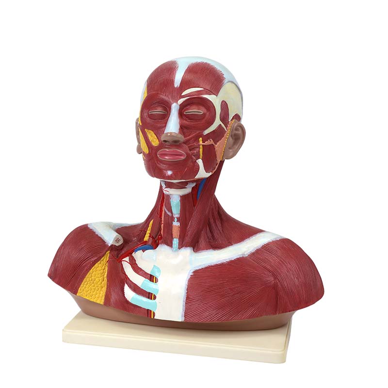 本模型完整呈現頭部面部表情肌、咀嚼肌、頭頸淺層肌肉分布,肌肉層次分明、輪廓清晰。直觀講解面部表情形成、咀嚼運動原理及頭頸肌肉運動系統結構。適用于初中生物課堂教學、實驗演示、醫學解剖入門、面部科普教學。