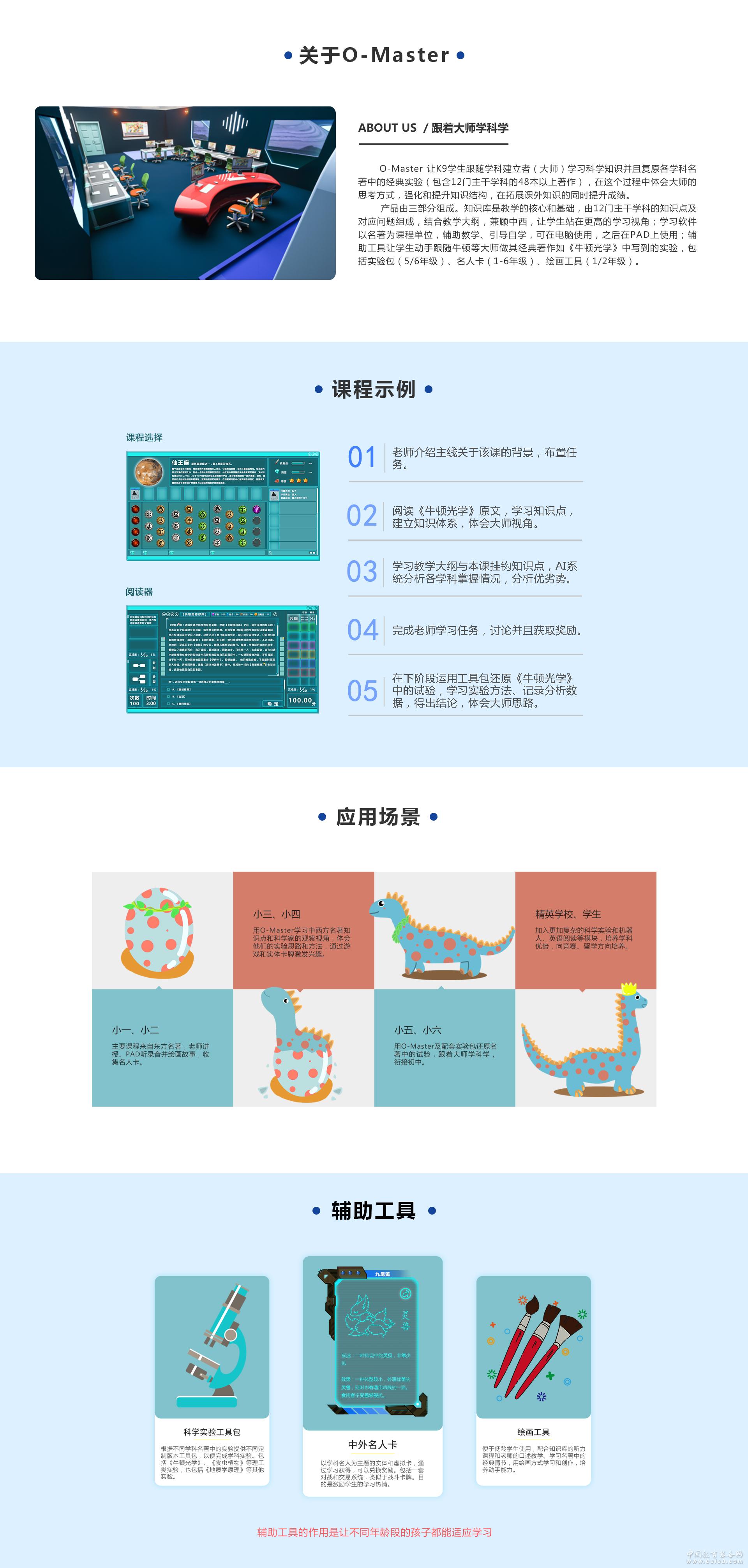 產品詳細介紹產品由三部分組成。知識庫是教學的核心和基礎,由12門主干學科的知識點及對應問題組成,結合教學大綱,兼顧中西,讓學生站在更高的學習視角;學習軟件以名著為課程單位,輔助教學、引導自學,可在電腦使用,之后在PAD上使用;輔助工具讓學生動手跟隨牛頓等大師做其經典著作如《牛頓光學》中寫到的實驗,包括實驗包(5/6年級)、名人卡(1-6年級)、繪畫工具(1/2年級)。