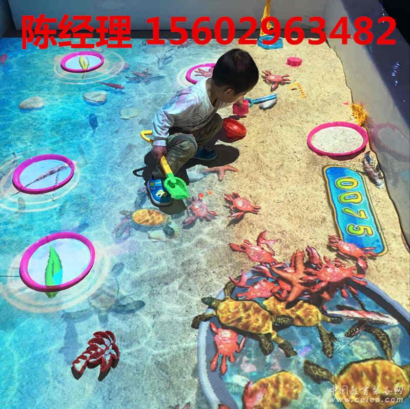 小朋友置身虛擬現實的海洋場景中,沙灘邊散落投影著時隱時現的海星、貝殼、海螺,還有可寄放小朋友捕撈成果的魚缸。小朋友可以“下海”捕魚,將魚兒存放到岸邊的魚缸里。還有農場場景,小朋友可以為種子施肥、澆水,等開花結果后,還可以采摘收獲果實,體驗有趣的農家樂……