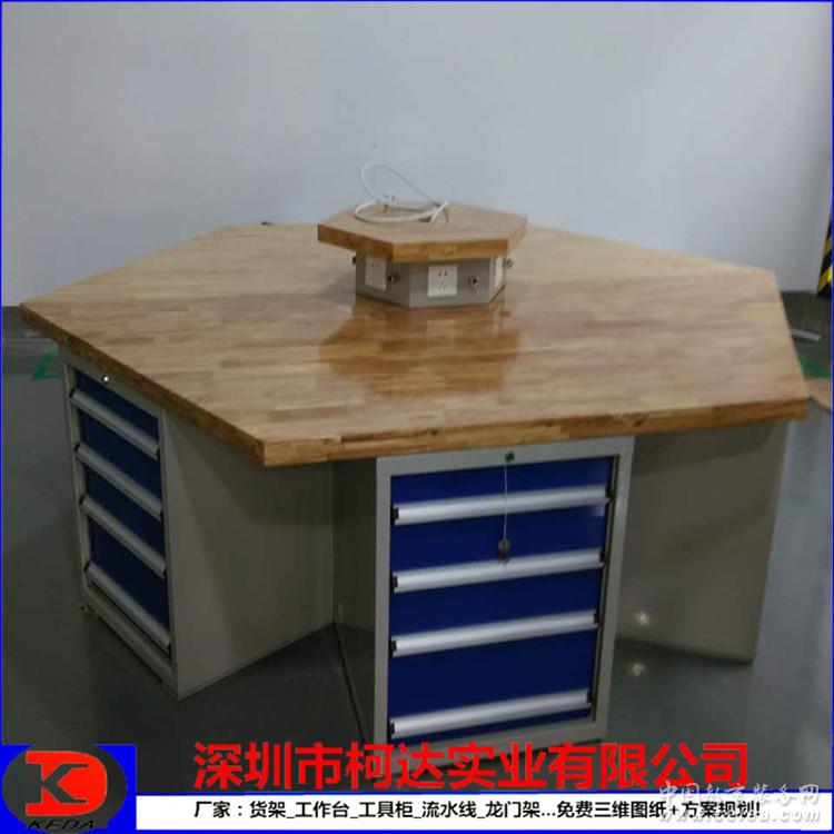 常規標準六角工作臺詳細參數 專業制造六角工作臺/鉗工臺 *尺寸:2400*1200*800,每個工位邊長為1200mm,臺面采用50mm厚的綠色高分子復合桌面; *臺面下部配置六個工具柜600×540×750mm;工具柜配置4個抽屜,抽屜大小一般為:2×100mm,1*150mm,1*200mm,每抽承重80kg,可85%抽出。 *柜體采用1.2mm厚優質冷軋板精工制作而成。 *臺面上一般可配4寸或6寸或8寸大小的6個臺虎鉗 *表面為烤漆處理,顏色一般為綠色或藍色
