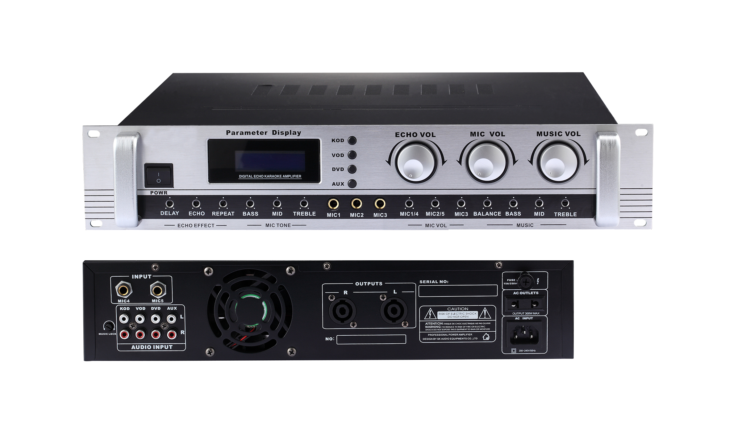 產品詳細介紹1、多種DSP卡拉OK演唱模式、4種音樂DSP預設模式可供選擇,帶卡拉OK激勵效果,單片機控制,性能穩定可靠。 2、藍色背光LCD液晶顯示調節參數LED專業顯示屏專業級數碼回聲電路,使人聲更加豐富自然。 3、整體設計根據卡商業使用要求,其音量、音色及效果采用隱藏式調節,保證工作可靠。 4、強制冷風扇加強本機的散熱,滿足長時間工作。 5、★前后扳均設有麥克風輸入插孔,從整體美觀到工作安裝都極為方便。 6、★適合KTV包房、多媒體教室、會議室使用。 7、輸出功率:2×200W |