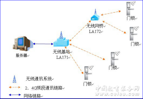 無線物聯網智能鎖集中管理系統的通信網絡分兩部分:無線通信網絡和有線通信網絡。 門鎖與無線基站之間是通過無線信號進行通信的,無線基站與管理軟件之間是通過有線以太局域網通信的。 一般每個樓層可組成一個無線通信網絡。其中有一個無線基站,若干個無線網橋,及數量比較多的無線聯網門鎖。無線網絡是由無線基站創建,無線網橋和無線門鎖以就近原則自動路由加入。