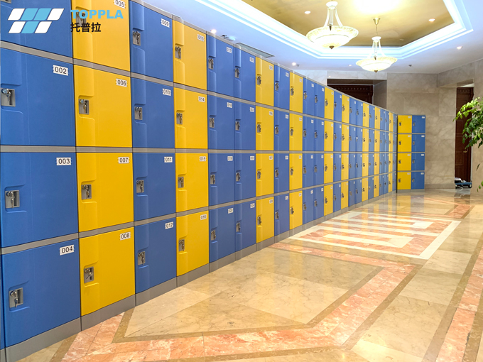 此撞色校園儲(chǔ)物柜解決方案采用托普拉第一代全塑儲(chǔ)物柜T-382S,4門1列、多列組合而成,采用經(jīng)典藍(lán)黃配,大氣不失活力。