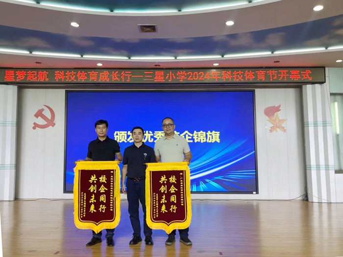 發(fā)表演講后,三星小學(xué)有關(guān)領(lǐng)導(dǎo)向安道教育贈(zèng)送錦旗并合影留念。隨后,共同觀看了文藝表演。