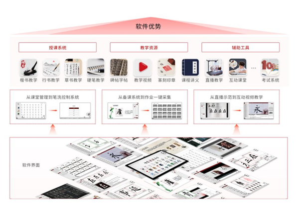 針對書法學科特點,基于智慧教室模型,提供書法教學工作中所需的三十余種子軟件系統。既有完善的授課系統,豐富的教學資源,還有便捷高效的輔助教學工具軟件,從課堂管理到筆洗控制系統,從備課系統到作業一鍵采集,從直播示范到互動視頻教學,滿足老師各方面需求的同時,支持開放式個性化服務。