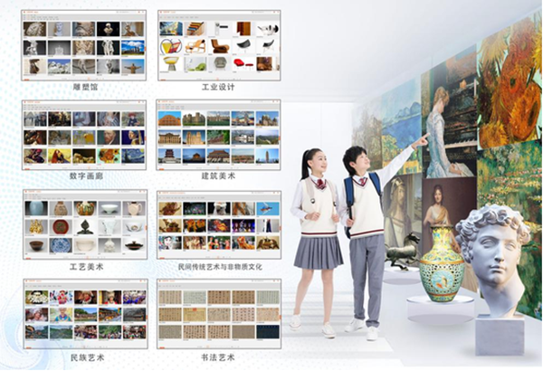 提供優質高精度的美術教學素材資源,包括書法藝術、民族藝術、數字畫廊、民間傳統藝術與非物質文化、工藝美術、工業設計、雕塑館和建筑藝術八個板塊。通過先進的采樣、制作和展示技術,將不同門類的藝術作品高度還原在教學場景中,實現藝術作品沉浸式鑒賞。達到作品細節高精度展示的同時滿足普適教育與專業教育的不同需求。