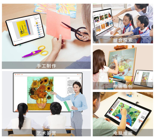 產品借助豐富的軟件功能、課程資源和智能設備幫助老師更好開展四大類藝術實踐課程,方便學生進行繪畫臨創、手工制作、藝術設計、欣賞鑒賞以及項目實踐等活動。產品在服務于美術課堂教學的同時,同時提供豐富的內容和功能用于支持課后延時服務、書法美術社團活動、特色課程開展和藝術創新實踐等學校美育活動。