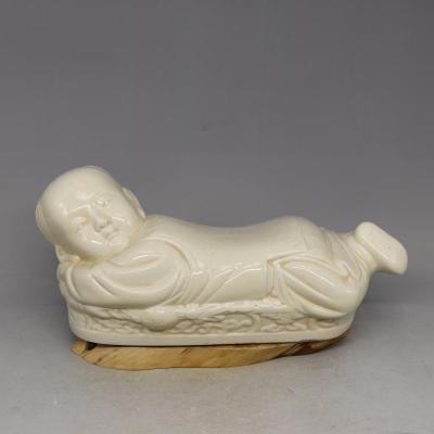 一種瓷器樣式,以“定窯、景德鎮(zhèn)燒制為最美。枕作為孩兒伏臥于榻上狀,以孩兒背做枕面,故名“孩兒枕”。此枕整體線條柔和流暢,兼具實用和欣賞價值。現(xiàn)藏于故宮博物院的這件定窯孩兒枕,釉色牙黃,工藝精巧,先使用模具燒制成型,再加以精細的雕工,活潑可愛的孩童側臥于榻上,雙臂緊抱置于頭下,兩腳疊壓稍稍抬起,孩兒神態(tài)栩栩如生,是中國陶瓷史上的經典之作。