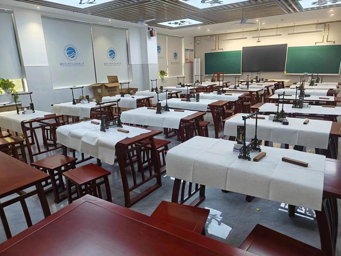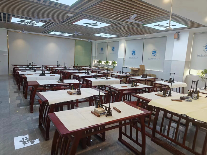 仿古實木書法桌、專業(yè)筆掛、硯臺池一應(yīng)俱全;墻飾以國學經(jīng)典字畫,配備了現(xiàn)代化的多媒體教學設(shè)備,方便老師示范運筆細節(jié),實現(xiàn)傳統(tǒng)與現(xiàn)代的完美融合。