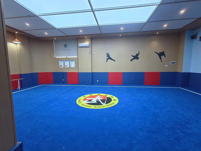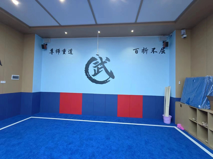 鋪設(shè)專業(yè)武術(shù)軟墊,有效保護學生在翻滾跳躍時免受傷害;墻飾以“武道”渲染,整個空間洋溢著陽剛正氣與紀律感。