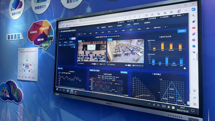 由現(xiàn)代中慶提供技術(shù)支持的西寧市南川西路小學(xué)智慧教研展區(qū),以“‘智課’驅(qū)動(dòng)精準(zhǔn)教學(xué) 數(shù)據(jù)賦能智慧教研”為主題展示了學(xué)校基于AI課堂教學(xué)數(shù)據(jù)開展精準(zhǔn)教學(xué)反思,以及通過備、磨、聽、評(píng)、賽模塊開展備教學(xué)評(píng)一體化的AI精準(zhǔn)教研的應(yīng)用場景。