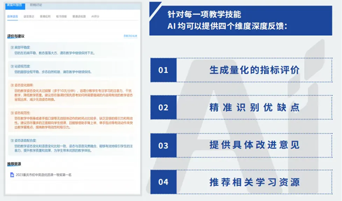 針對識別出的每一個問題,AI系統會提供具體的改進意見,并推薦相關的優質教學案例或理論學習資源。這種“診斷+建議+資源”的一體化反饋,使師范生的改進有了明確的方向和抓手,實現了“靶向提升”。