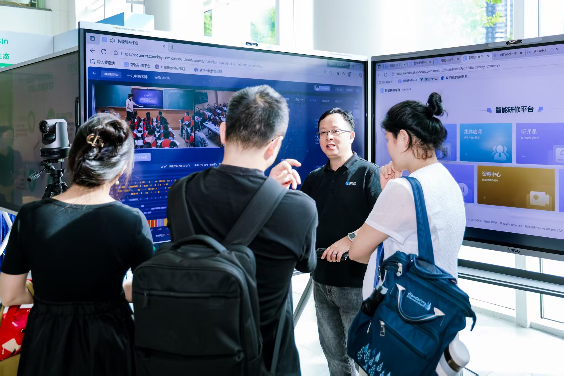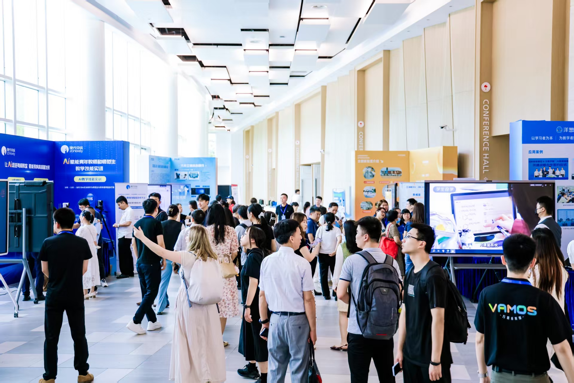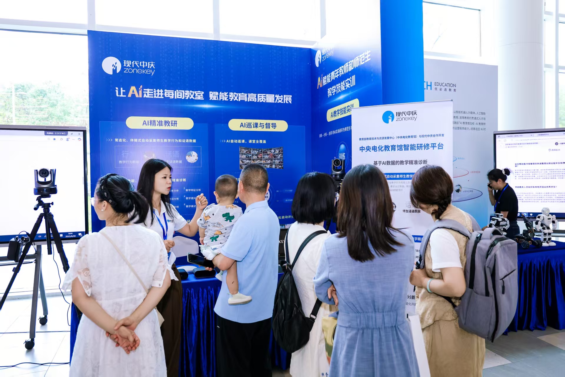 研討會期間,同時舉辦的“智能科技教育裝備展”,旨在為參會者提供一個直觀、沉浸、互動的AI教育場景體驗平臺。現代中慶展出了多個教育AI應用方案。包括AI精準教研,AI巡課與督導,AI教學技能實訓等,讓與會嘉賓沉浸式體驗了AI賦能下教師專業成長和教學質量管理范式的數字化轉變。