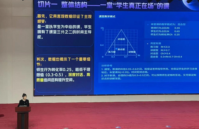 在隨后的專家評課環節,芝罘區教育裝備與技術研究中心徐松鑫專家結合AI教學數據分析報告,進行了數據支撐的精準點評與指導。報告中的客觀數據,如師生互動頻率分布、教學活動時間分配、學生課堂參與度指標等,為專家評課提供了直觀、量化的參考依據,使教學評價從經驗判斷走向證據支持,從定性描述轉向定性定量相結合,顯著提升了教研活動的科學性與針對性。
