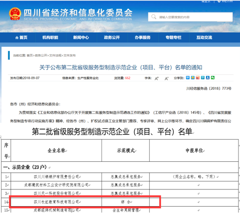 省級服務型制造示范企業(yè),是為貫徹落實《中國制造2025》和《發(fā)展服務型制造專項行動指南》重要部署,推動制造業(yè)由生產型制造向服務型制造轉變,其生產技術與工藝、服務能力與水平等應該具有一定優(yōu)勢地位。企業(yè)能夠圍繞核心制造能力開展模式創(chuàng)新并形成競爭力,在戰(zhàn)略規(guī)劃、管理運營、模式創(chuàng)新、信息網(wǎng)絡平臺建設、服務績效、生產服務類人才培養(yǎng)等方面取得一定成果�!胺⻊招椭圃臁笔莻鹘y(tǒng)制造與現(xiàn)代服務業(yè)相融合發(fā)展的新型業(yè)態(tài),是未來制造業(yè)轉型升級的重要方向。經地方經濟和信息化主管部門推薦、專家評審、網(wǎng)上公示等環(huán)節(jié),最終,長虹教育榮獲“2018年四川省服務型制造示范企業(yè)”殊榮。