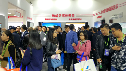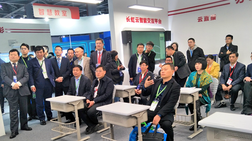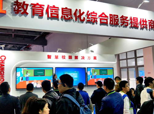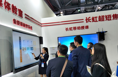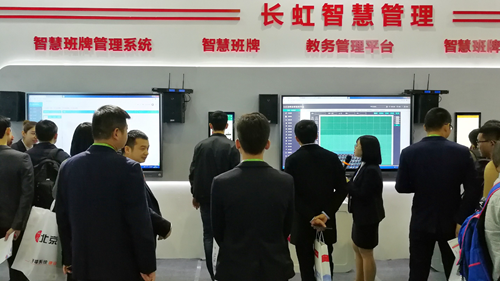 長虹攜智慧教室、云智能交互方案、打通一三產業的智慧廚房系統和教務管理平臺、智慧班牌、云交互一體機等涵蓋從智慧教學、智慧管理、智慧服務到智慧環境完整教育信息化產品體系亮相展會。憑借突出的方案理念和產品實力,一開幕就贏得了行業人士和參觀者的廣泛關注。