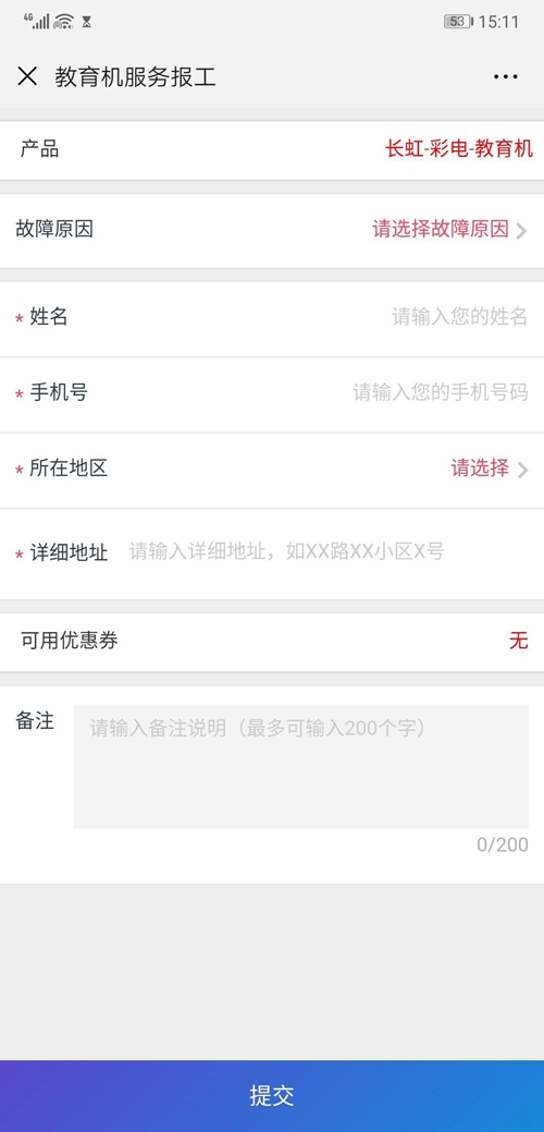 填寫“您的姓名、手機號、所在地區、詳細地址”,點擊提交后,我們收到信息后第一時間將與您取得聯系,解決您的使用問題。