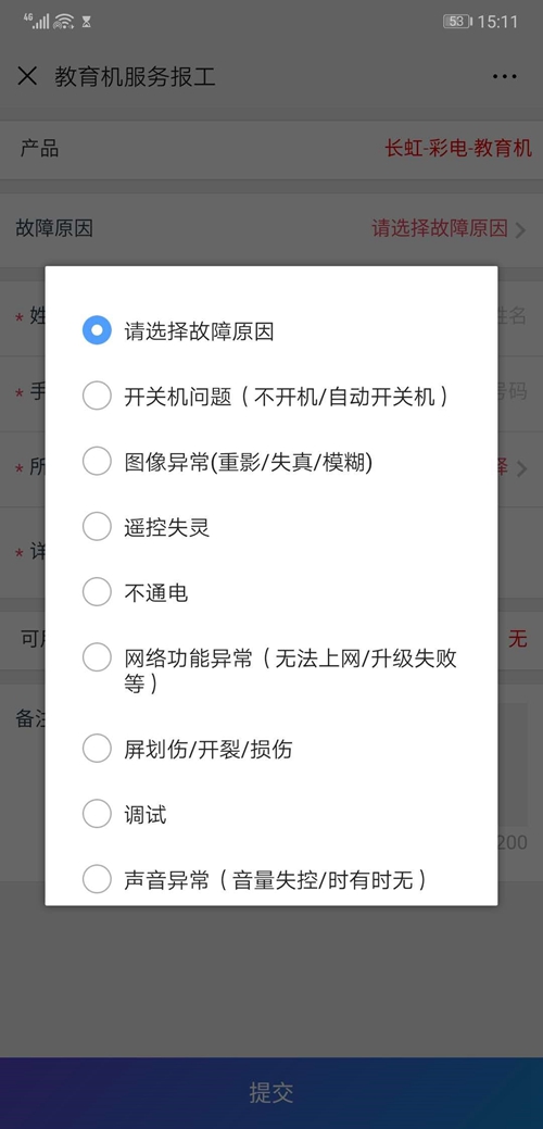 填寫“故障原因”: