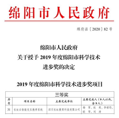 近日,綿陽(yáng)市人民政府發(fā)布《關(guān)于授予2019年度綿陽(yáng)市科學(xué)技術(shù)進(jìn)步獎(jiǎng)的決定》,長(zhǎng)虹教育的“長(zhǎng)虹云智能交互教學(xué)系統(tǒng)項(xiàng)目”研究成果被授予2019年度綿陽(yáng)市科學(xué)技術(shù)進(jìn)步獎(jiǎng)三等獎(jiǎng)。