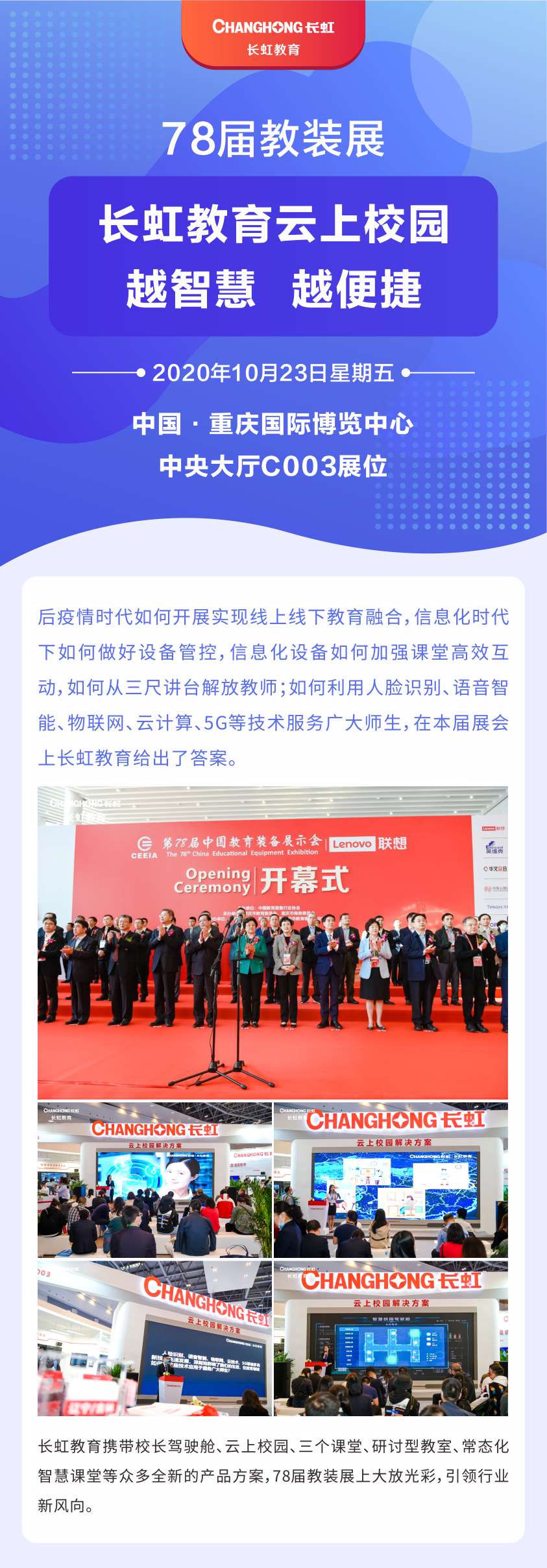 2020年,不僅是全民抗疫的一年,也是教育信息化改革突破的一年。長虹教育通過語音智能、人臉識別、物聯網及5G技術等模塊,將理想成為現實,讓想象發生!長虹云上校園更多驚喜等您發現,10.23-10.25,重慶國際博覽中心中央大廳C003長虹教育展位,恭候您的到來!、